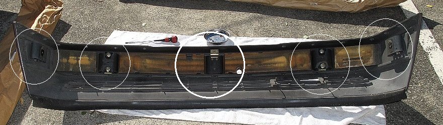 | 4:外気温度センサーのラバーグロメットを外してビスを外す | 5:バンパー中央の固定ナットを外す | 6:バンパー両端のマウントブラケットボルトを外す |