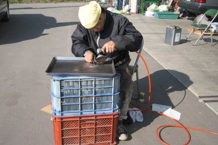 天気も良く暖かい日だったので外に作業台を作ってバルブ研磨中です