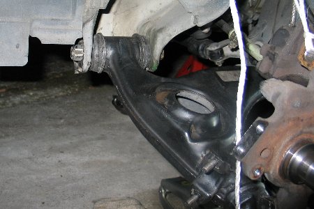 ロアームの取り付けです ブッシュ側をはさんで仮止め(写真は木材に乗せている)