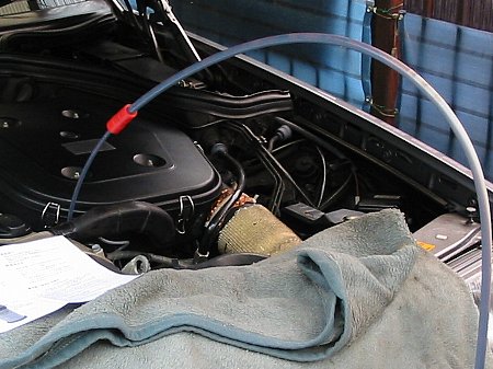 細いホースをレベルゲージの穴に突っ込んで太いホースに繋げます