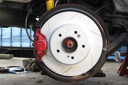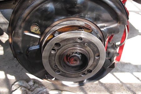 パーキングブレーキシューを新品に交換してローター、パッドを取り付けます