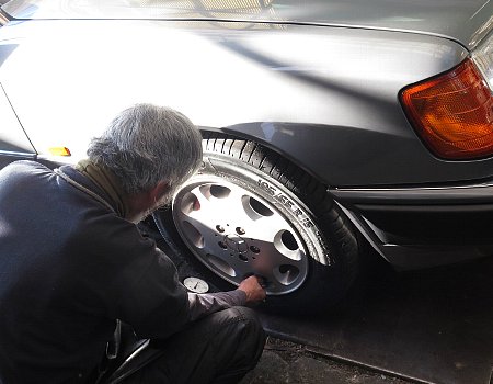 まずはホイルの確認(W124の純正ホイルは程度が良いとのこと)掃除などして