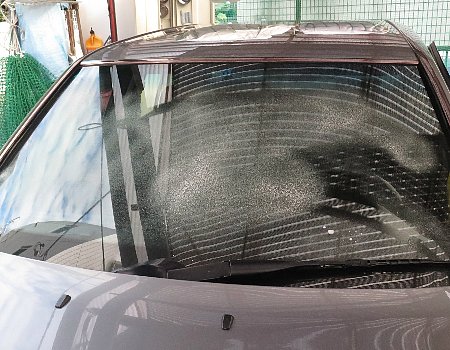 ワイパー動かす前に傷防止のウインドウ用ガラスクリーナーをしておきます