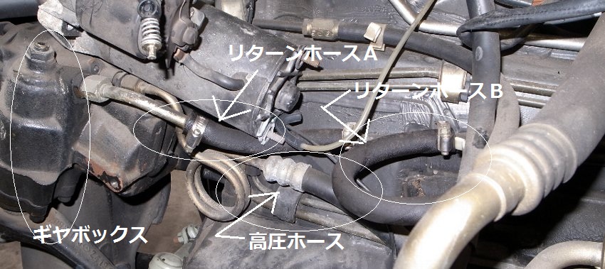 パワステポンプで加圧されたオイルは『高圧ホース』を通して『ギヤボックス』にいきます