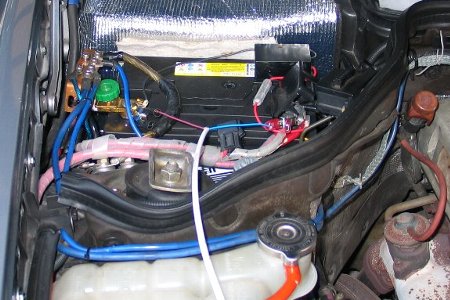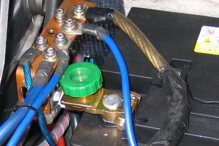 配線を引きこんでバッテリー端子を外して『ワニ口クリップ』でバッテリーに付けています