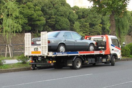 積載車に乗って「崎山自動車サーヴィス」さんに到着です