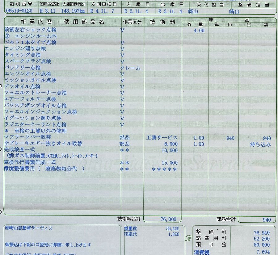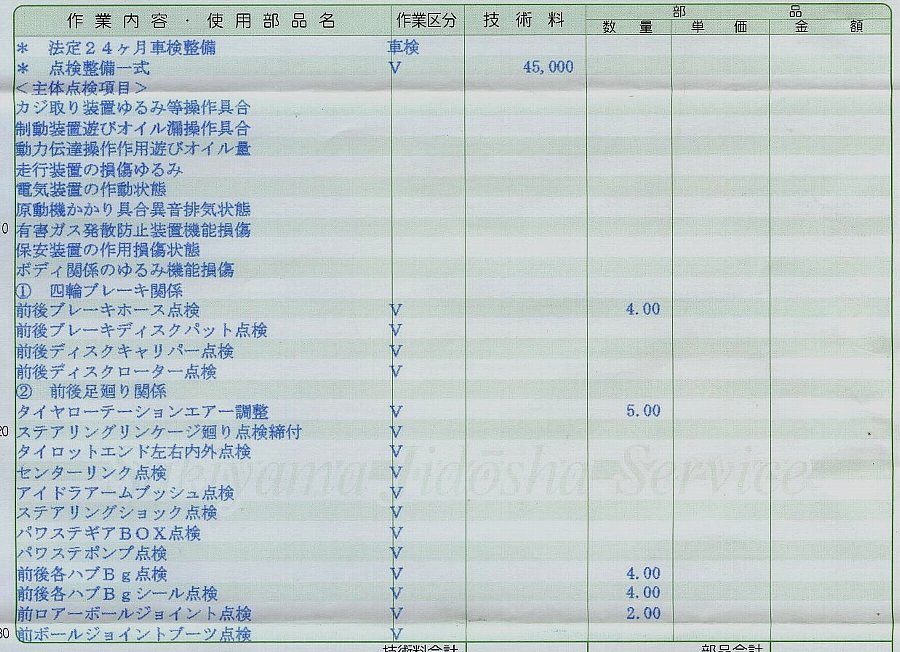 2020年度崎山自動車さんに頼んだ24ヶ月点検の明細書です