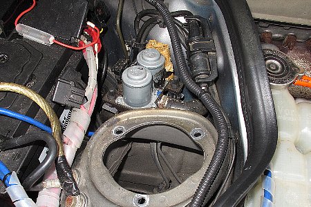 左ハンドル車のヒーターバルブ場所は右側アッパーマウントの横です