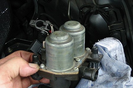 ホースバンドを緩めてホースを抜きます(前側一本後ろ側二本)